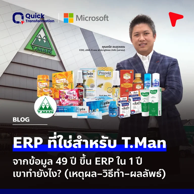 กรณีของ T.Man Pharma สะท้อนชัดว่า การเปลี่ยนระบบ = การเปลี่ยนวิธีทำงานทั้งองค์กร เมื่อมี One Direction เลือกเทคโนโลยีแกนหลักที่เหมาะสม (Microsoft D365 F&O) และพาร์ทเนอร์ที่เข้าใจอุตสาหกรรม (Quick Transformation) การขึ้นระบบภายในราว 1 ปี พร้อมสร้าง ฐานข้อมูลเดียว ที่รองรับนวัตกรรมและการเติบโตระยะยาวที่ทำได้จริง