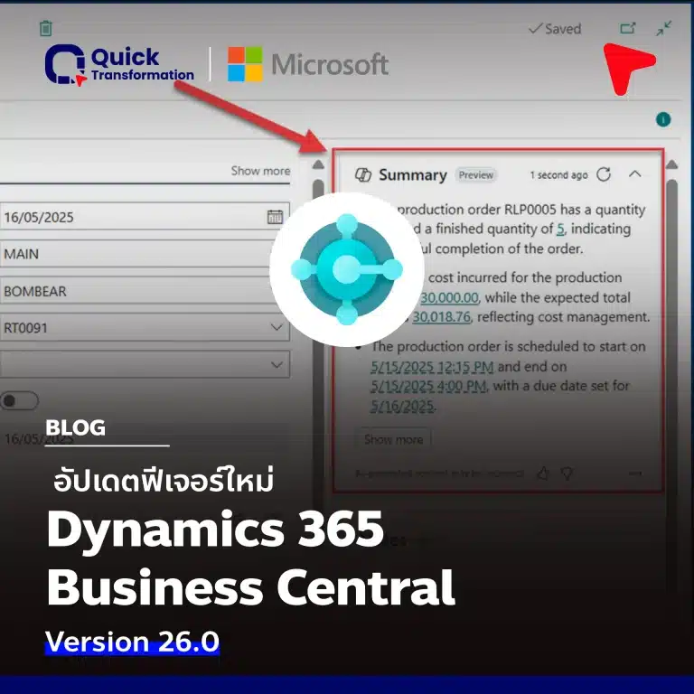 การอัปเกรด Business Central 26.0 ให้ได้ผลลัพธ์ที่ดี ไม่ได้อยู่ที่ฟีเจอร์ใหม่เพียงอย่างเดียว แต่อยู่ที่การวางแผนการใช้งานที่เหมาะกับกระบวนการจริงของแต่ละองค์กร ทีมงาน Quick Transformation พร้อมให้คำปรึกษา วางแผนการเปิดใช้ฟีเจอร์ใหม่ ออกแบบกระบวนการทำงาน เทรนผู้ใช้งาน และสนับสนุนจนใช้งานได้จริง