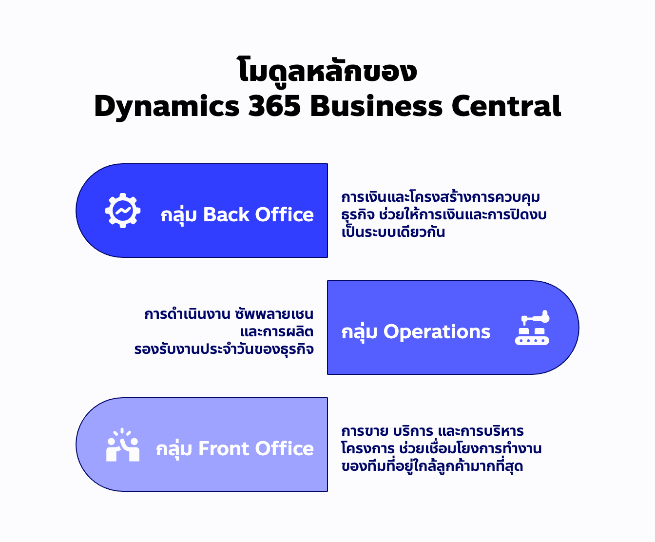 Dynamics 365 Business Central ถูกออกแบบมาให้เป็นระบบ ERP แบบครบวงจร ที่ครอบคลุมการทำงานหลักของธุรกิจตั้งแต่การเงิน การขาย การดำเนินงาน ไปจนถึงการวิเคราะห์ข้อมูล โดยสามารถจัดกลุ่มความสามารถหลักออกเป็น 3 กลุ่มใหญ่ตามบทบาทการใช้งานจริงได้ดังนี้