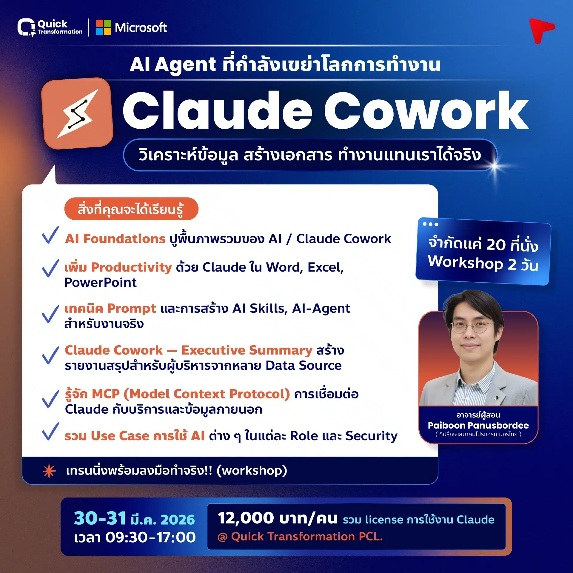 องค์กรชั้นนำทั่วโลกกำลังเปลี่ยนวิธีทำงานด้วย Claude Cowork เป็น AI Agent ที่ไม่ใช่แค่ตอบคำถาม แต่วิเคราะห์ข้อมูล สร้างเอกสาร และเชื่อมต่อระบบขององค์กรได้จริง หลักสูตรนี้ออกแบบมาเพื่อให้บุคลากรทุกระดับสามารถนำ Claude Cowork ไปใช้ในการทำงานได้ทันที ผ่าน Workshop ที่ฝึกปฏิบัติจริงทุก Session