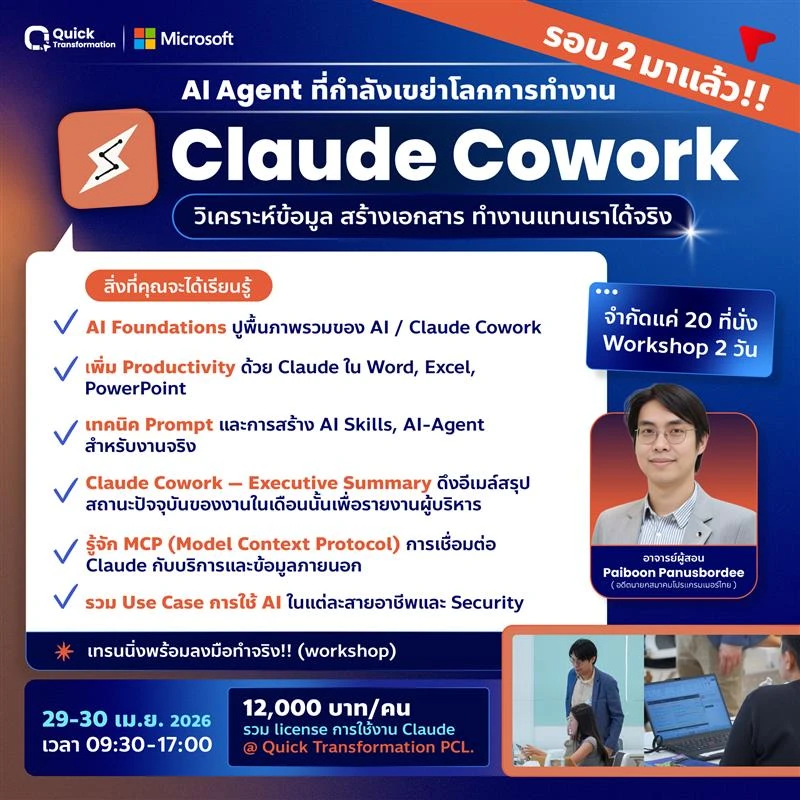 - ด้านทักษะส่วนบุคคล ผู้เข้าอบรมจะสามารถเขียน Prompt ได้อย่างมีประสิทธิภาพ ออกแบบ AI Skill เฉพาะทางสำหรับทีมของตนเอง และใช้ Claude ช่วยสร้างเอกสาร Word, Excel และ PowerPoint ได้ภายในเวลาอันสั้น ลดภาระงานซ้ำซ้อนได้อย่างมีนัยสำคัญ