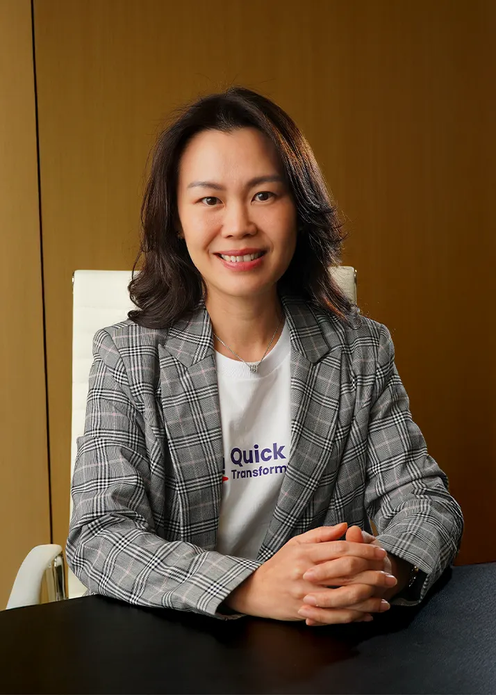- คุณประภาภรณ์ วัฒนวรางศิกูร ประธานเจ้าหน้าที่ฝ่ายการเงิน (Chief Financial Officer: CFO) บริษัท ควิก ทรานส์ฟอร์เมชั่น จำกัด (มหาชน)