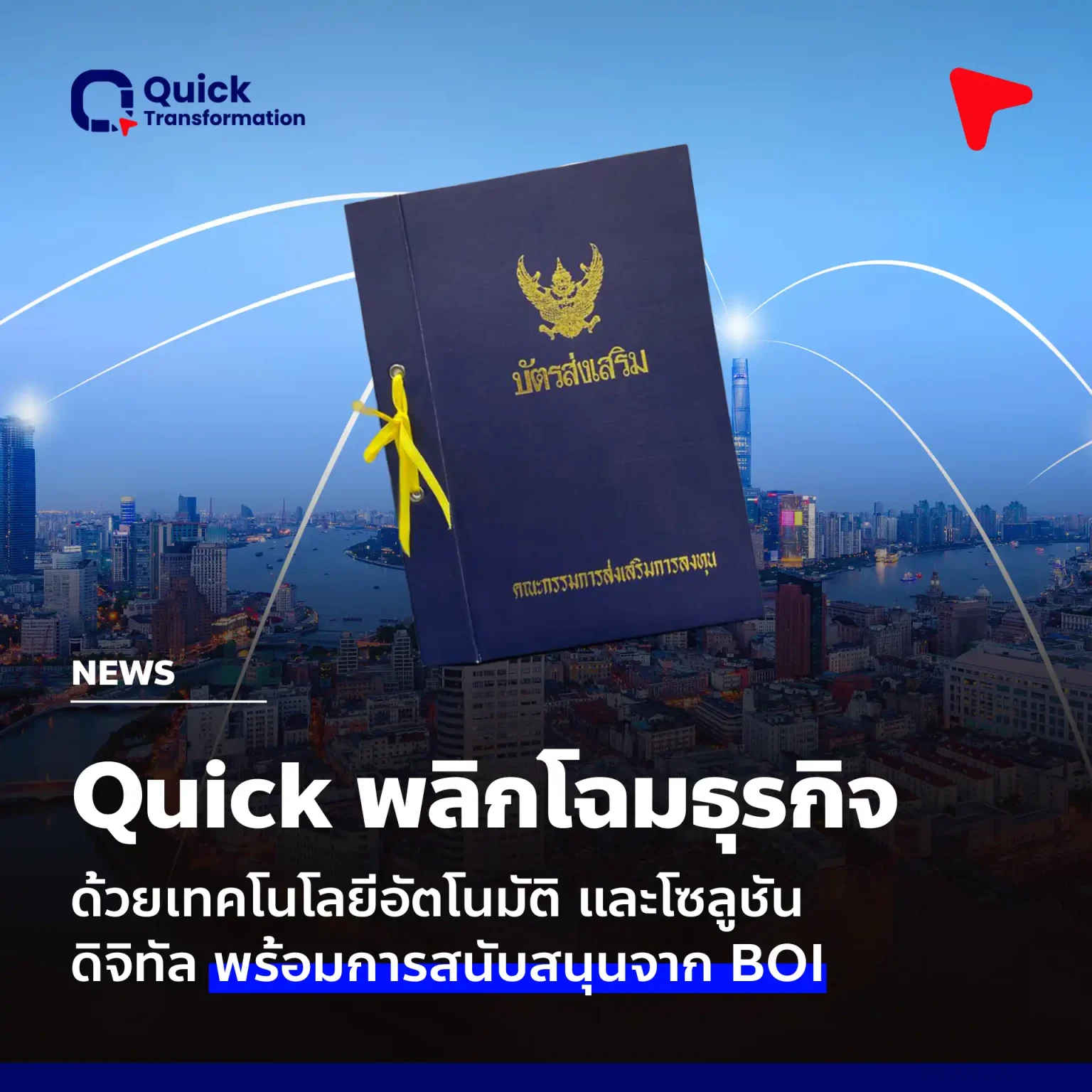 Quick Transformation ได้รับการอนุมัติจากสำนักงานส่งเสริมการลงทุน (BOI) เพื่อสนับสนุนการพัฒนาเทคโนโลยีอัตโนมัติ โซลูชันดิจิทัลที่ทันสมัย เพื่อตอบโจทย์และพร้อมผลักดันลูกค้าสู่ความสำเร็จได้อย่างเต็มศักยภาพ