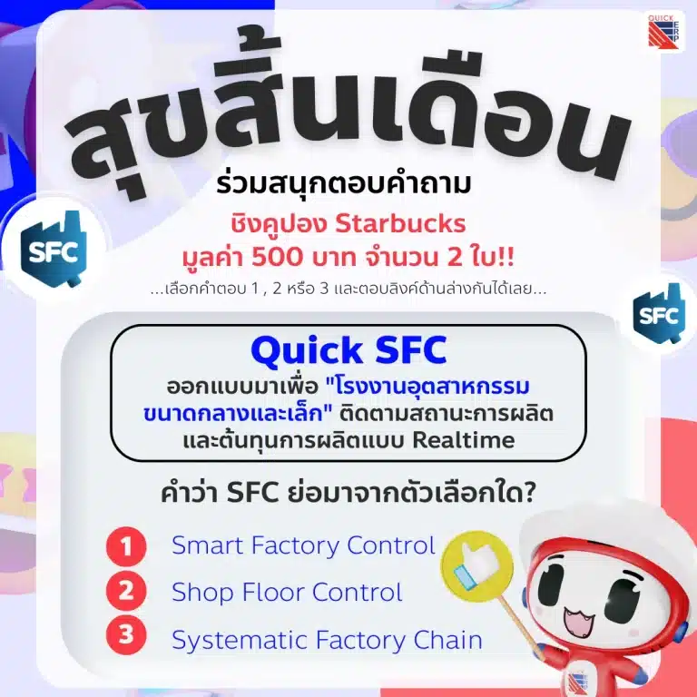 Quick MESออกแบบมาเพื่อ "โรงงานอุตสาหกรรมขนาดกลางและเล็ก" ติดตามสถานะการผลิตและต้นทุนการผลิตแบบ Realtime "คำว่า SFC ย่อมาจากตัวเลือกใด?"