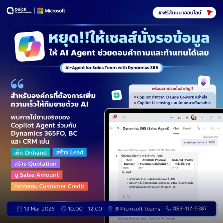 สัมมนาออนไลน์ฟรี 2 ชั่วโมงนี้ Quick Transformation จะพาคุณดูการใช้งานจริงของ Copilot Agent ที่ทำงานร่วมกับ Dynamics 365 Finance and Operations, Dynamics 365 Business Central และ CRM เพื่อช่วยทีมขายทำงานเร็วขึ้น ลดงานซ้ำ และตอบลูกค้าได้ไวขึ้น