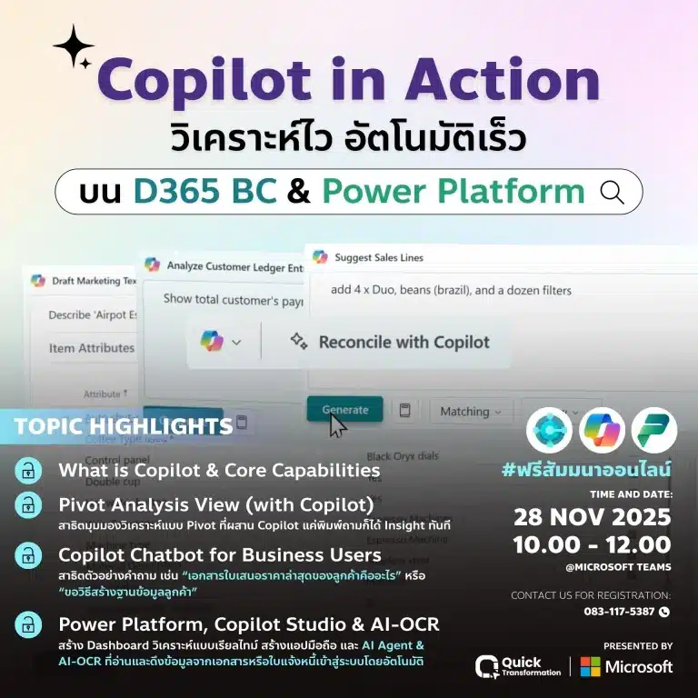 Unlock the Power of Copilot, D365 BC & Power Platform เรียนรู้การทำงานของ Microsoft Copilot บนระบบ ERP และ Power Platform เห็นการทำงานจริงของ AI ที่ช่วยลดงานซ้ำ วิเคราะห์ข้อมูลได้เร็วขึ้น และเชื่อมต่อกระบวนการทางธุรกิจให้ครบในที่เดียว